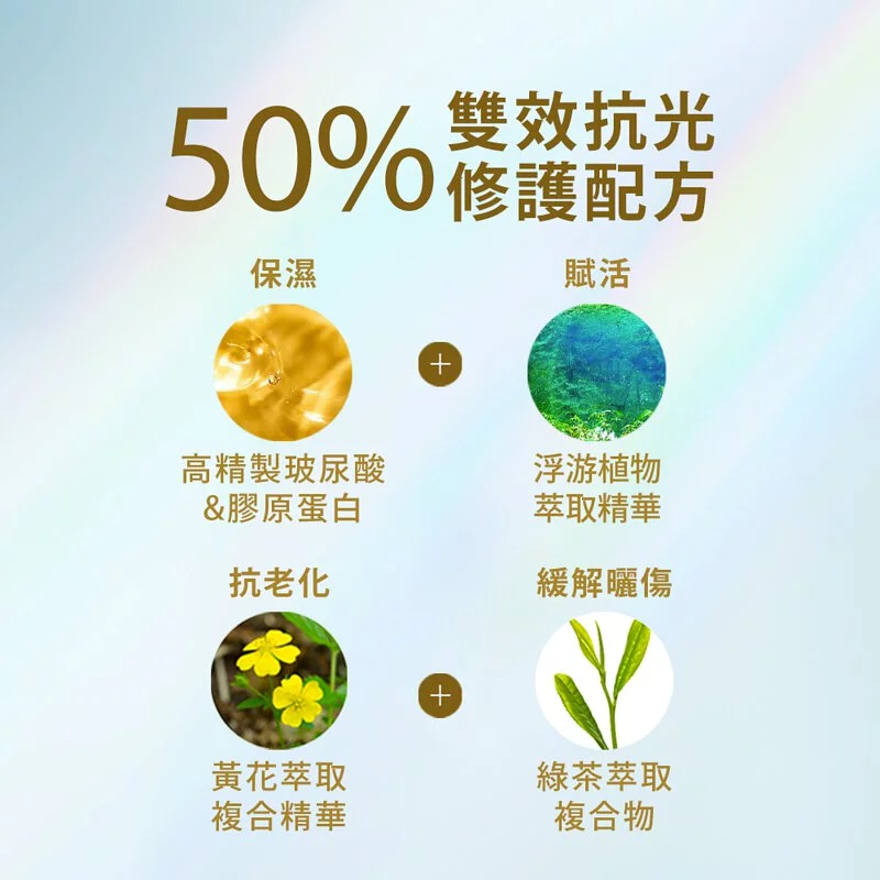 全新蘊含多重美顏保養精華,全天給肌膚美肌活力,極清爽質地,不黏膩不泛白,不怕厚悶後續上妝也超服貼,日常通勤都能完美輕盈防護!