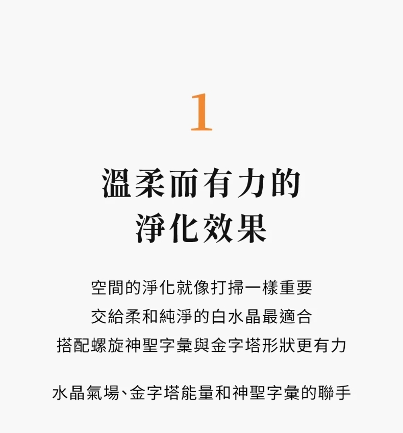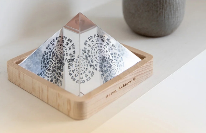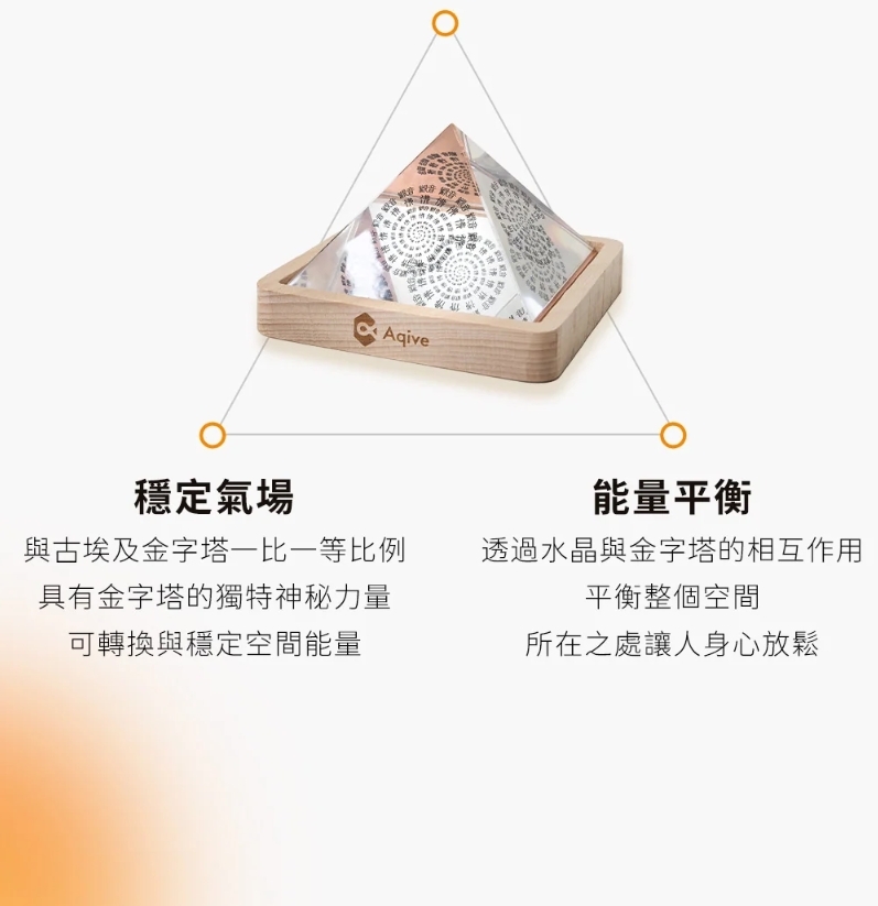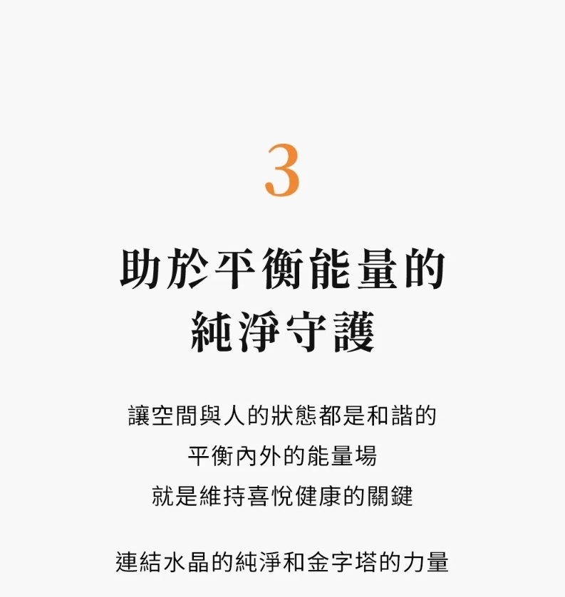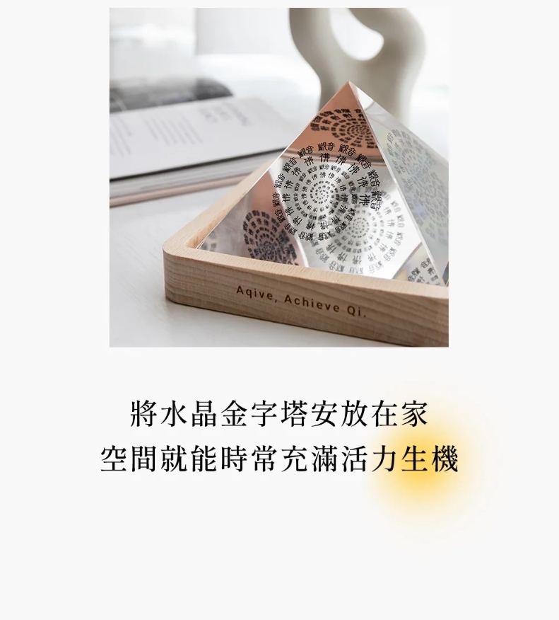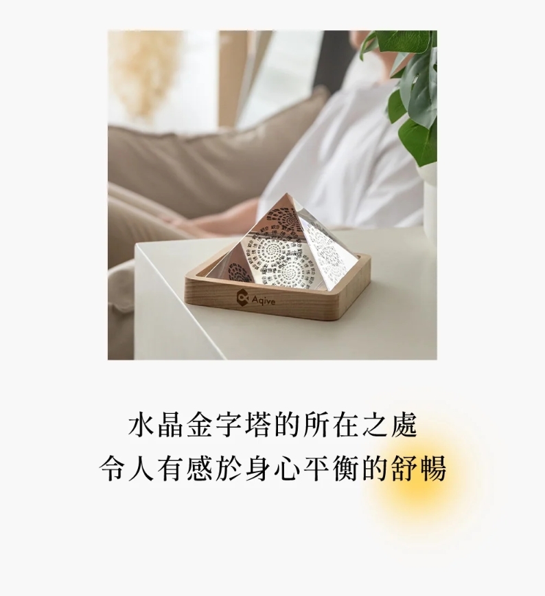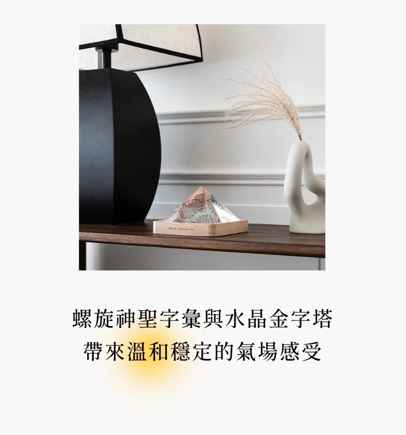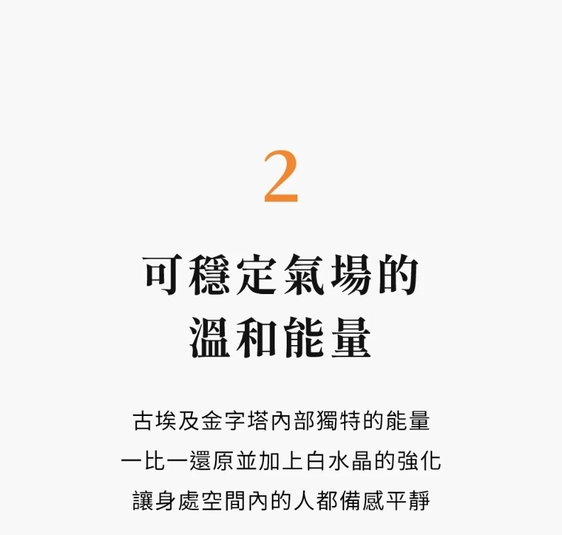 金字塔結構本身具有獨特能量,一比一還原呈現,並加上白水晶的強化,讓身處空間內的人都備感平靜。