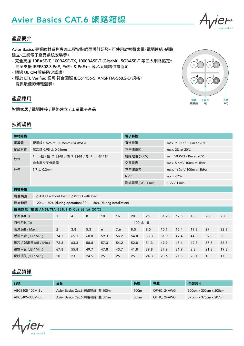 |Avier|Avier專業網路系列採用0.5mm純銅線導體(24AWG),最高傳輸速率可達10Gbps,支援PoE, PoE+ & PoE++供電。