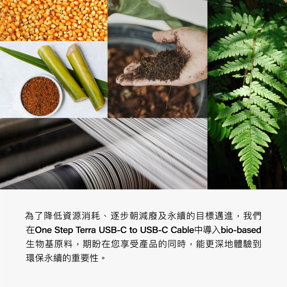 大多數塑膠產品使用油基材料,會向環境中排放有害氣體生產過程中的空氣,導致全球暖化和氣候變遷。 相較之下Terra線材採用18%生物基環保材料,而生物基材料則來自植物、農作物和樹木,其中含有碳水化合物。