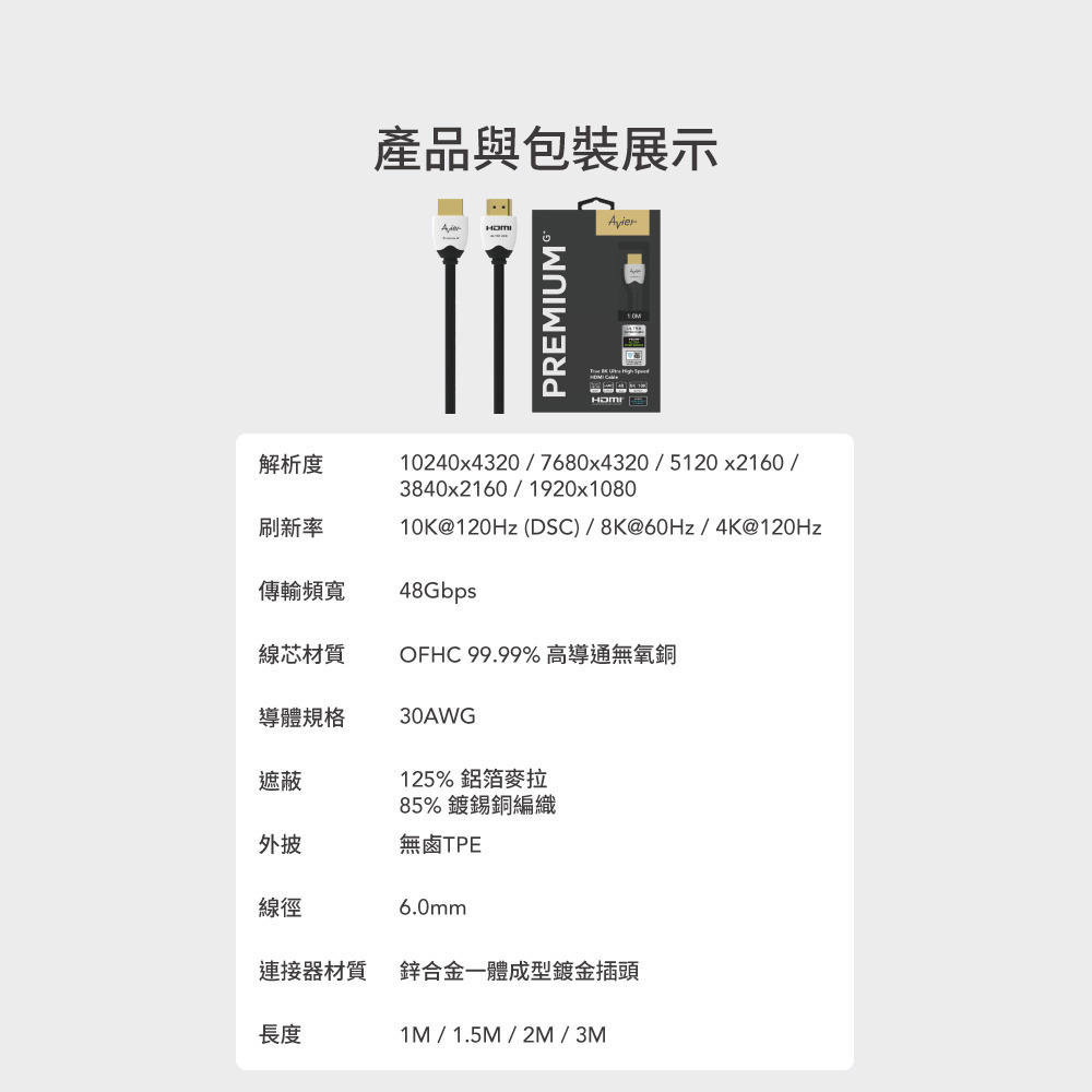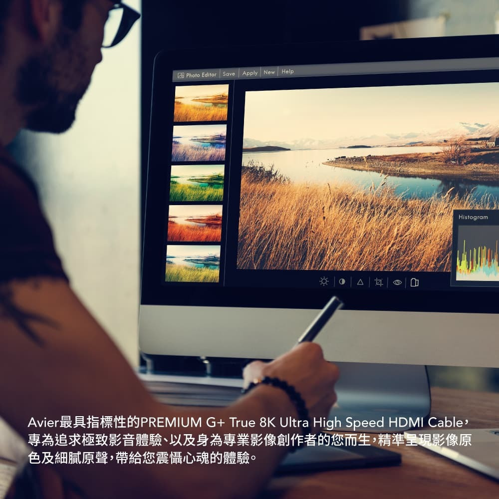 Avier 最具指標性的PREMIUM G+ True 8K Ultra High Speed HDMI Cable,專為追求極致影音體驗、專業影像創作者而生,精準呈現影像原色及細膩原聲,帶給您震懾心魂的體驗。
