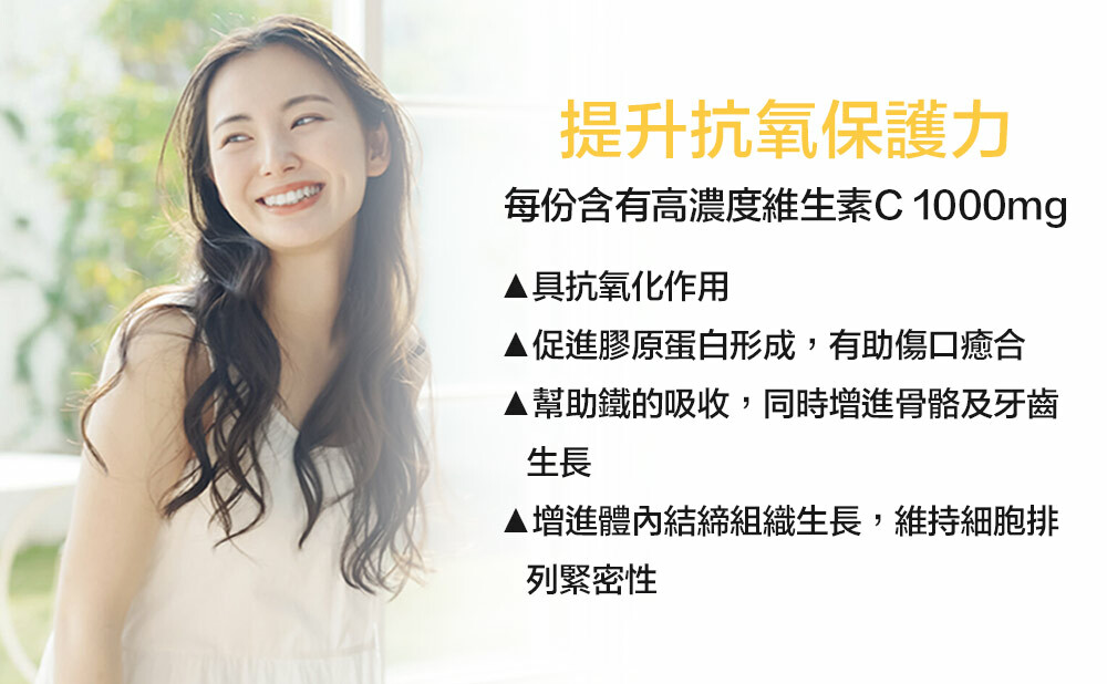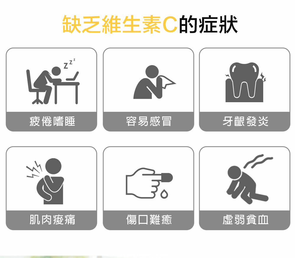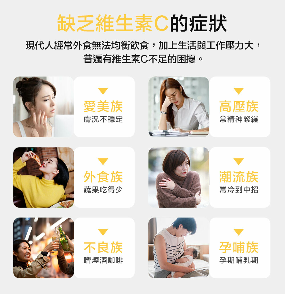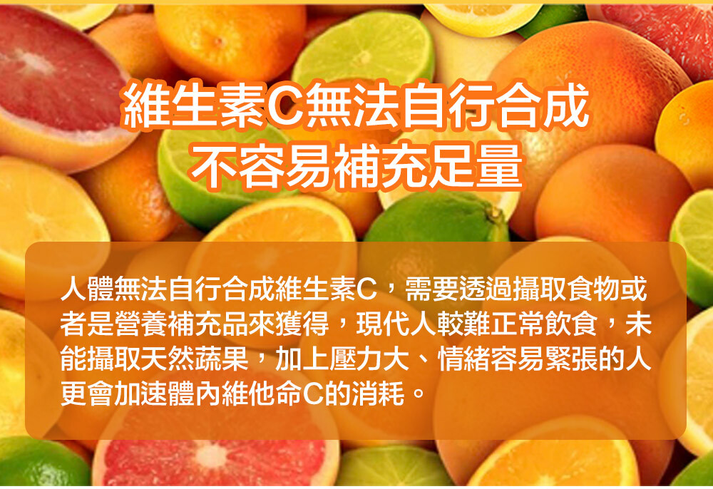 維他命C屬於水溶性維生素,不僅人體無法自行合成,而且不易儲存於體內,尤其當抽菸、喝酒、壓力過大或進行激烈運動時,更會加速維生素C流失,因此需要每天積極補充,以維護身心健康。