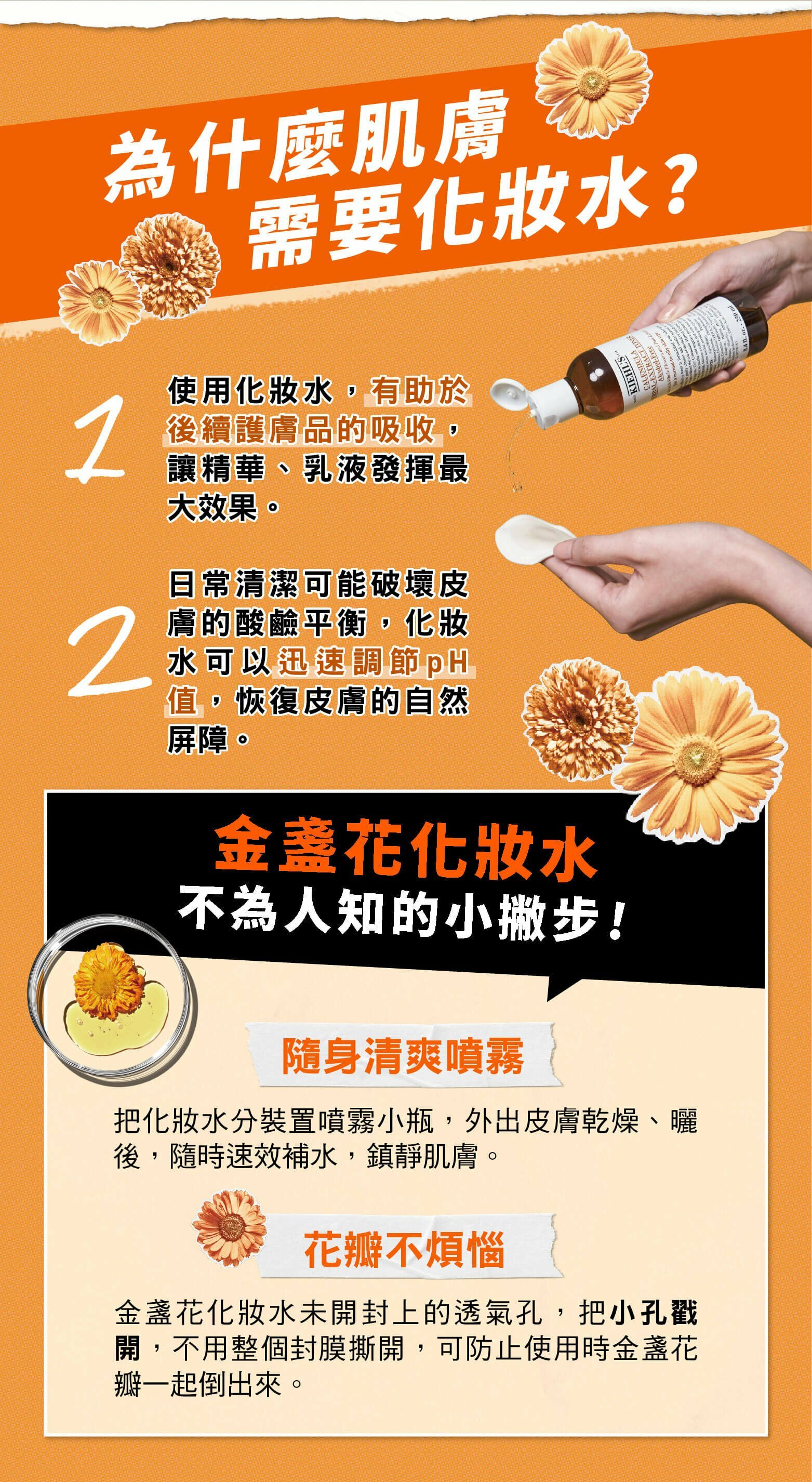 KIEHL‘S契爾氏運用獨家科技與技術,將金盞花活萃完美封存於花瓣中,再放入化妝水,且無添加酒精、無添加香料、無添加色素、無添加Paraben防腐劑,適用於各種肌膚 !有效減少粉刺痘痘、改善粗大毛孔、修復肌膚不穩定引起的泛紅,不想臉花?要用契爾氏金盞花才有效!
