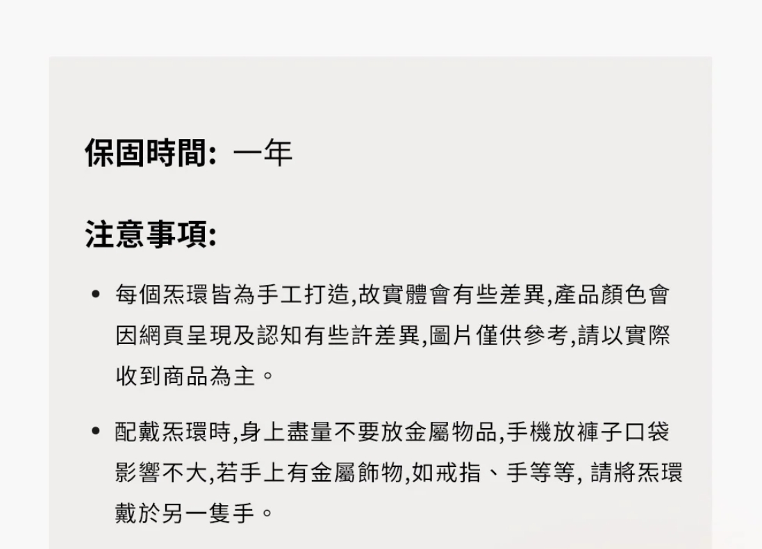・左右手配戴可能有不同體感,依目前使用者反饋最多為「配戴左手提高專注、右手氣場能量保護」,歡迎您交互替換體驗更多。