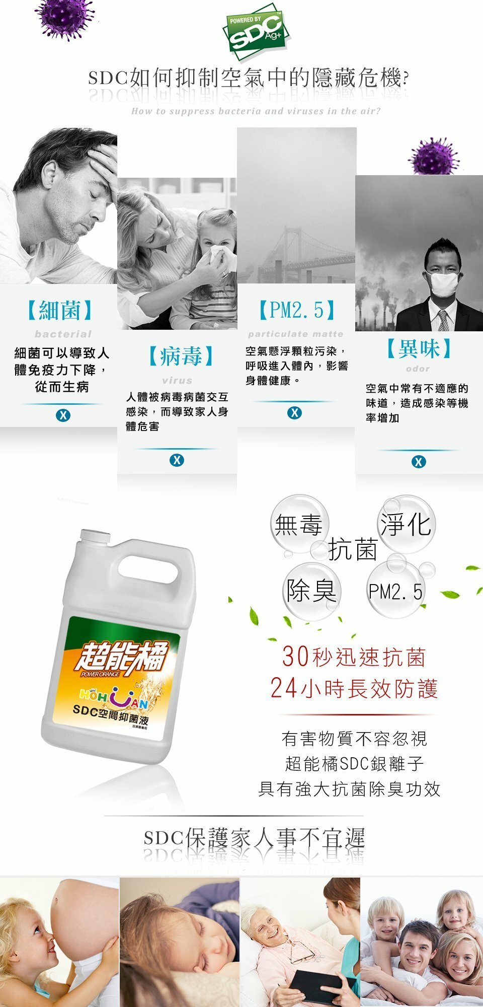「SDC空間抑菌液」,產品具備以下五大特色:1. 純天然成分 /安全無毒,不傷害人體與環境